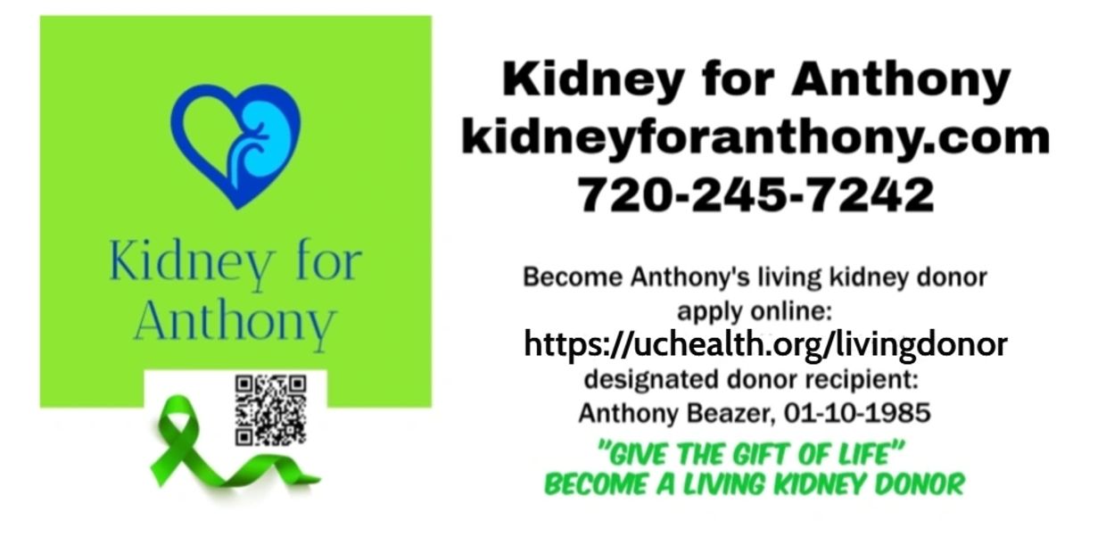 If you do not want to donate or are unable to donate, we ask that you share Anthony's story and information to help us find him a living kidney donor. Location of donor and blood type does not matter.